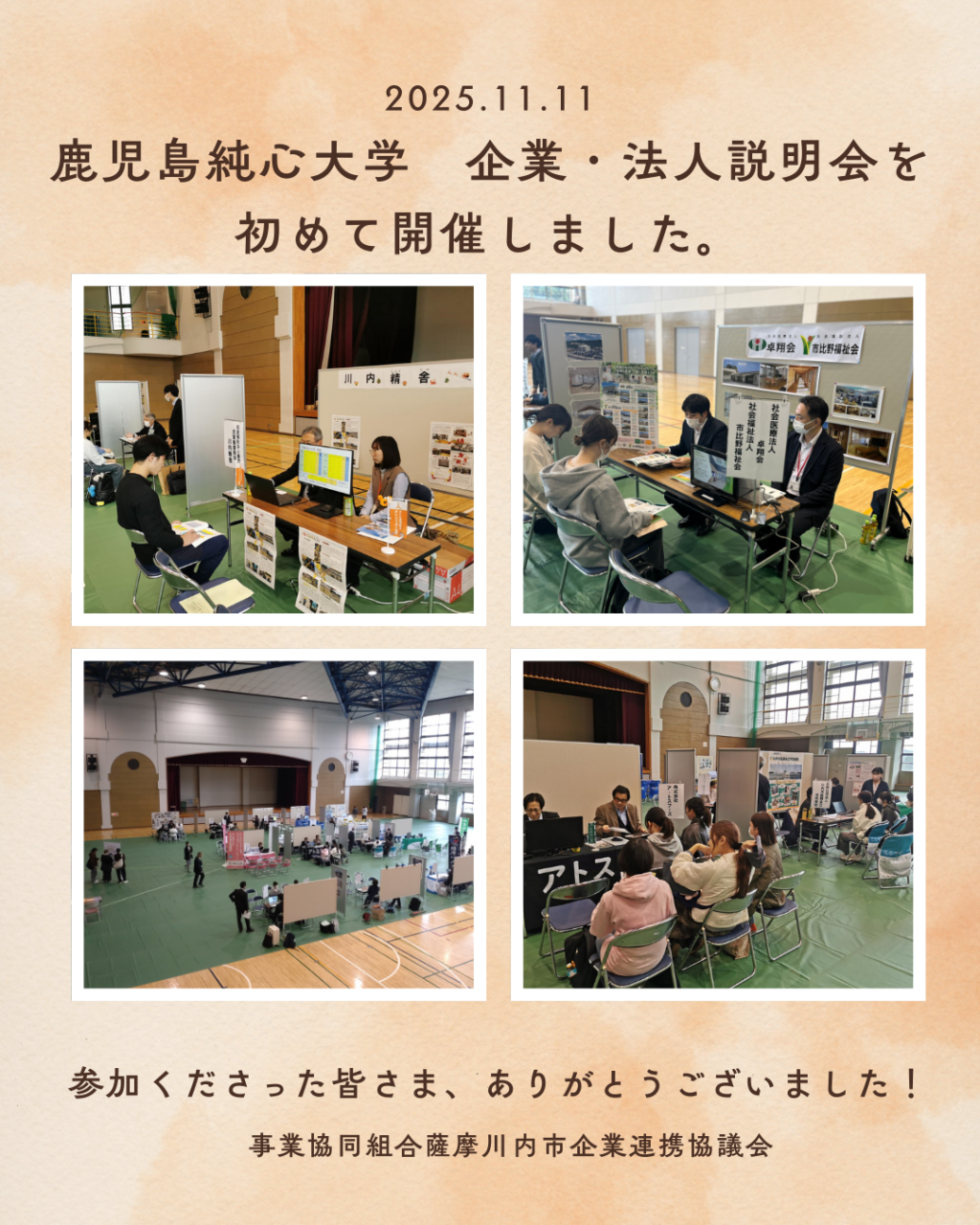 鹿児島純心大学 企業・法人説明会を開催しました。 2025.11.12 (水) Facebook Twitter LINE 鹿児島純心大学の学生に地元企業の事業や業務内容を良く知ってもらい、 地元企業への関心を高め、就職促進を図ることを目的に初めて開催しました! 当日は17社の企業が参加しました。 参加くださった皆さま、ありがとうございました。 会場:鹿児島純心大学 体育館 日時:令和7年11月11日(火)