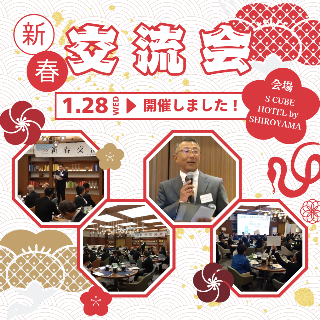 「令和8年新春交流会」を開催しました。 2026.1.29 (木) Facebook Twitter LINE 新春交流会を開催いたしました。 ご来賓の皆様、会員企業の皆様、関係者の皆様、ご参加くださりありがとうございました! 【日時】 2026年1月28日(水)18時開会 【会場】 S CUBE HOTEL by SHIROYAMA